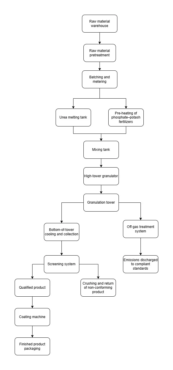 Le prillage est un procédé de fabrication avancé utilisant la gravité et l’échange thermique pour former des engrais composés (NPK). Un mélange fondu de matières premières NPK est pulvérisé depuis le sommet d’une tour de prillage (généralement de 80 à 110 mètres de haut) et refroidit pendant sa chute libre, se solidifiant en granulés sphériques creux. Ce processus continu, sans utilisation d’eau, permet d’obtenir des engrais à haute solubilité et à excellente absorption des nutriments.